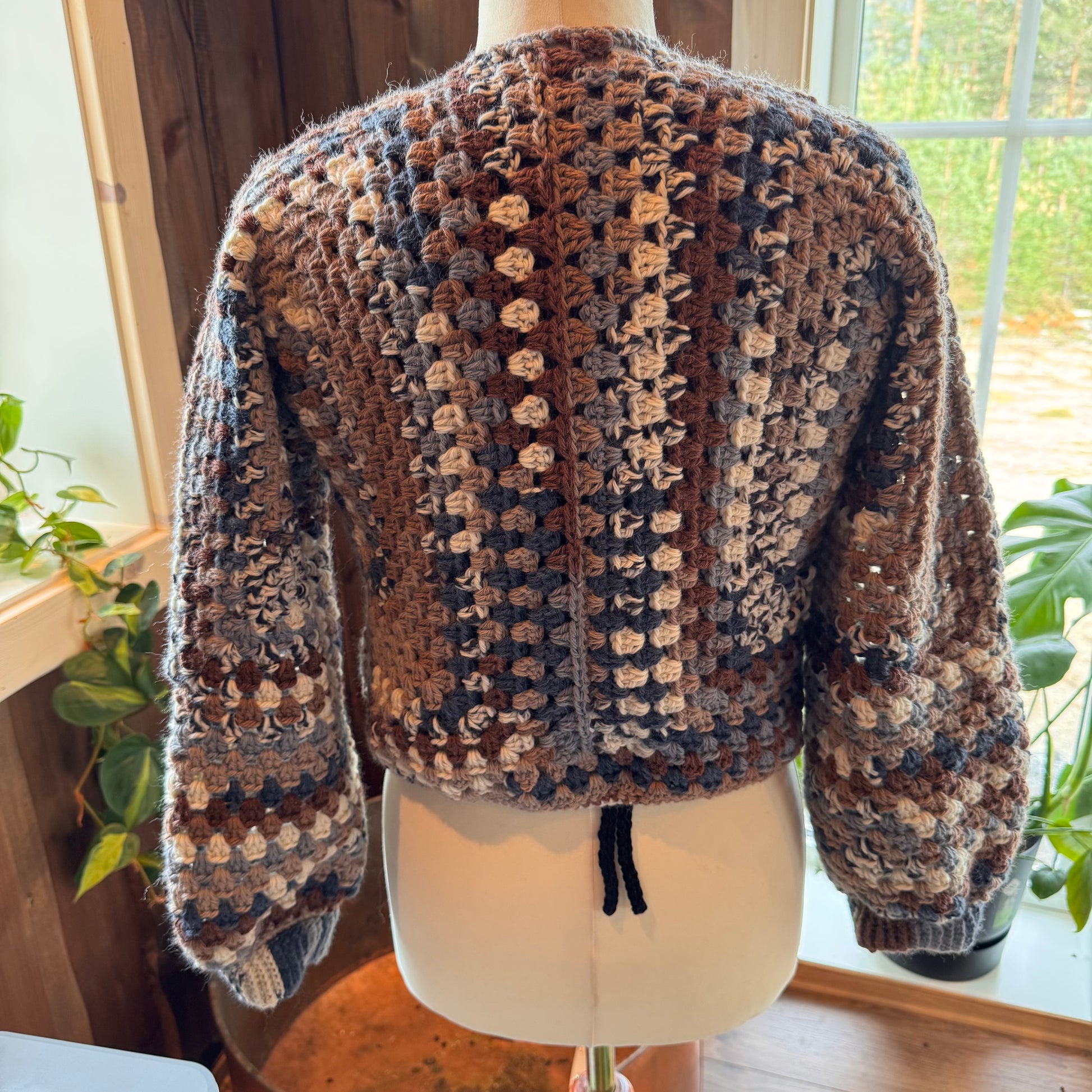 Denne cardiganen er det beste fra begge verdener, med grannystitch får du små «hull» som gjør at den holder deg varm uten å være så tett at det blir for mye, den er heklet i garn som består av 70% prosent Superwash ull og 30% nylon. Det vil si at den er varm og slitesterk.