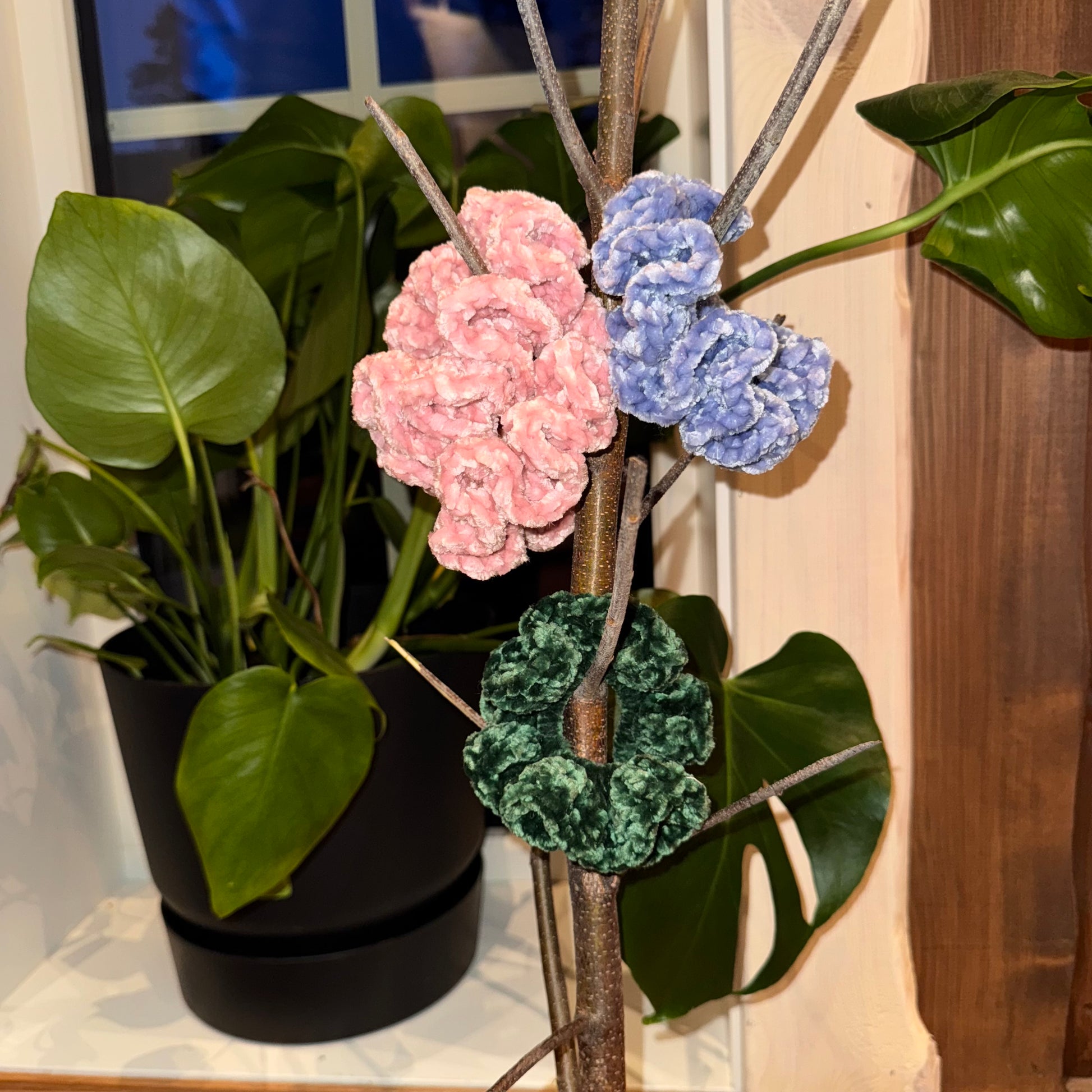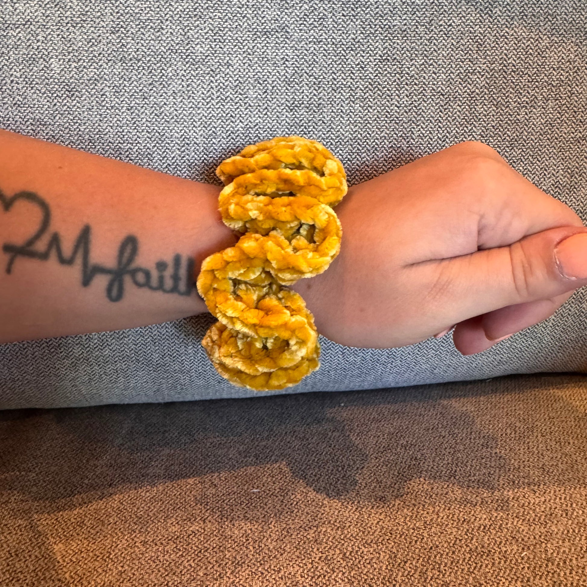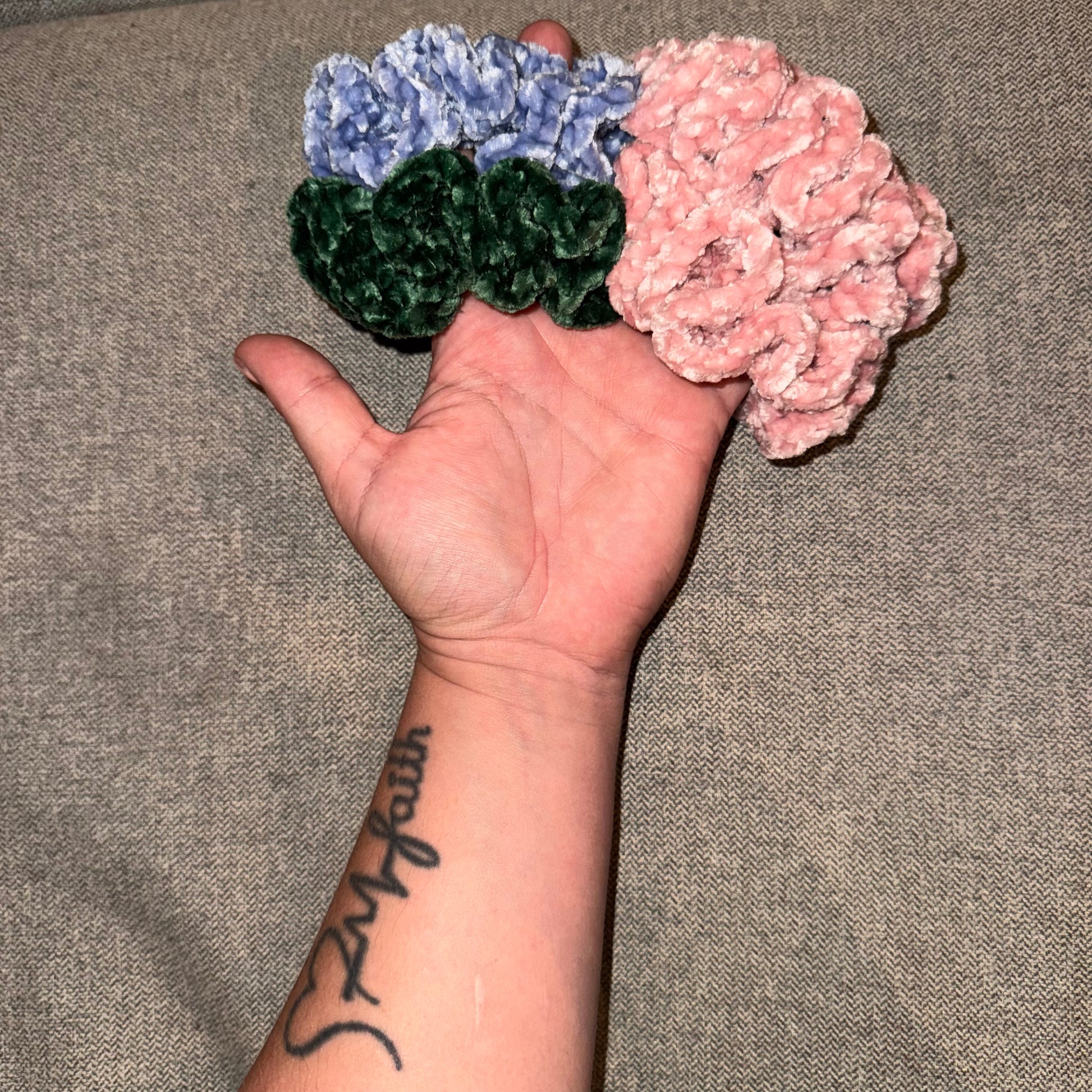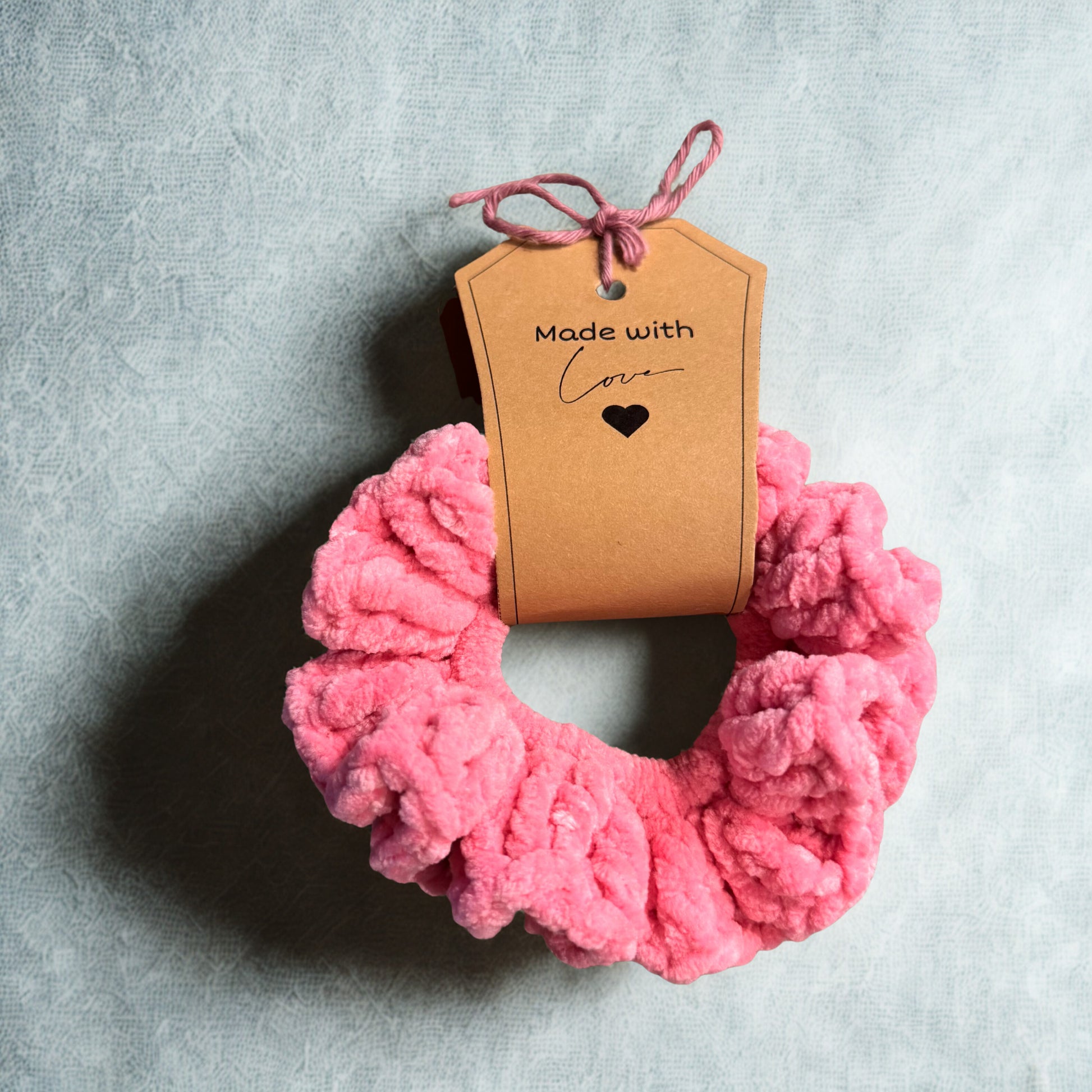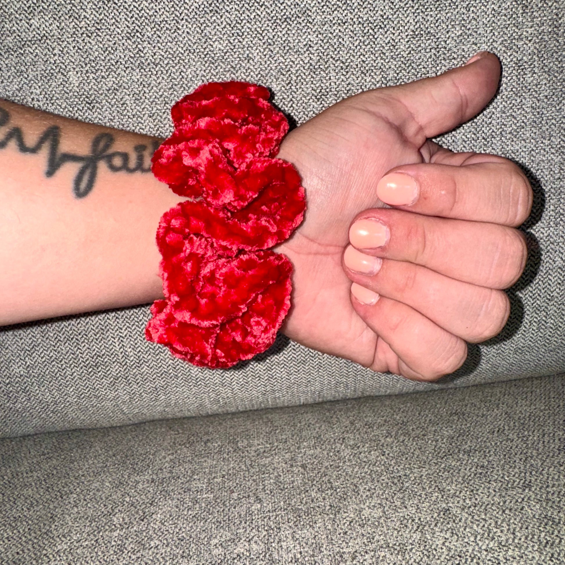 Deilige, freshe heklede scrunchies i velurstoff/chenille som gir ekstra løft til hestehalen, i tillegg til at den ser nydelig ut og sliter mindre på håret enn en vanlig strikk pågrunn av veluren